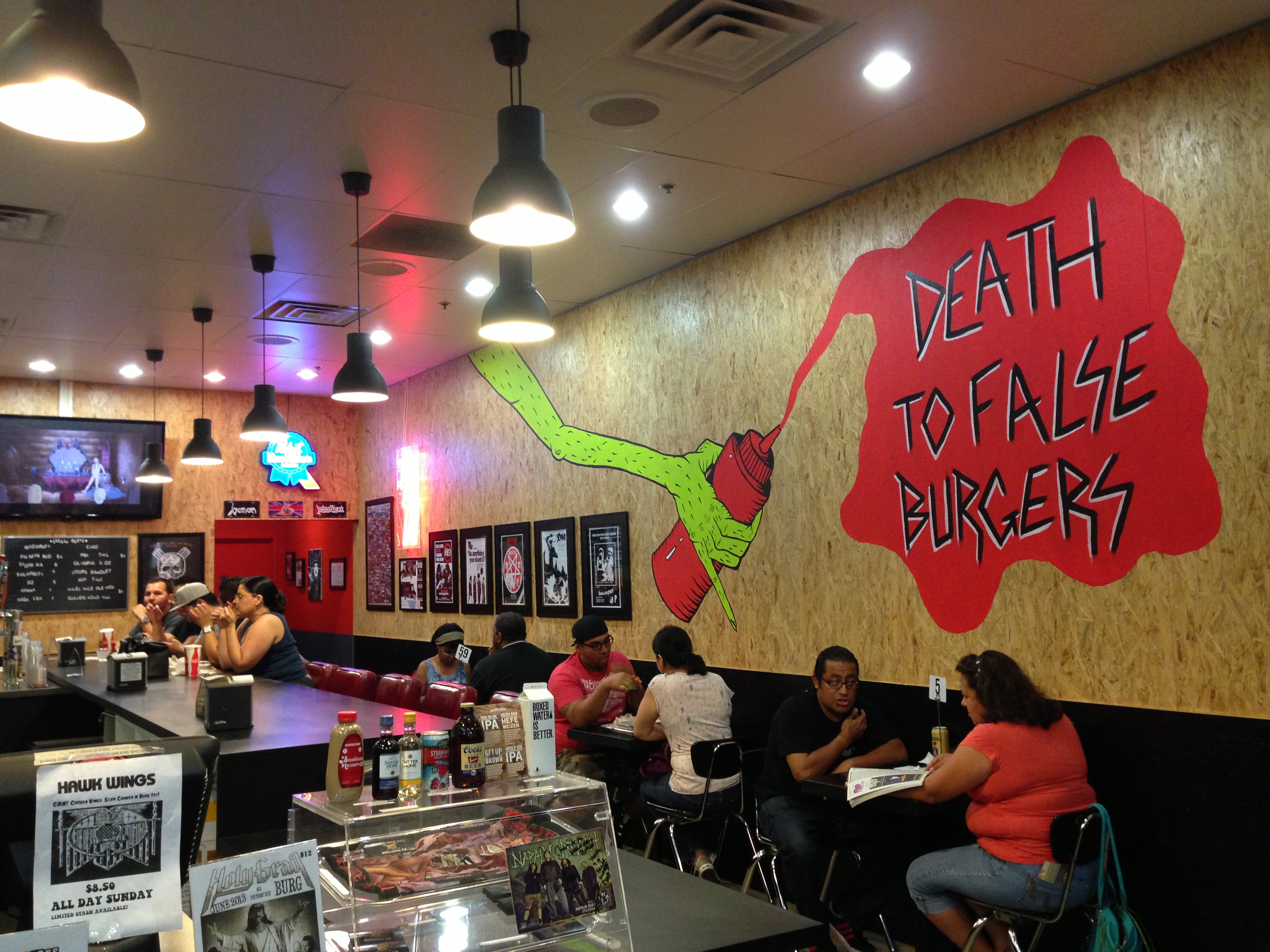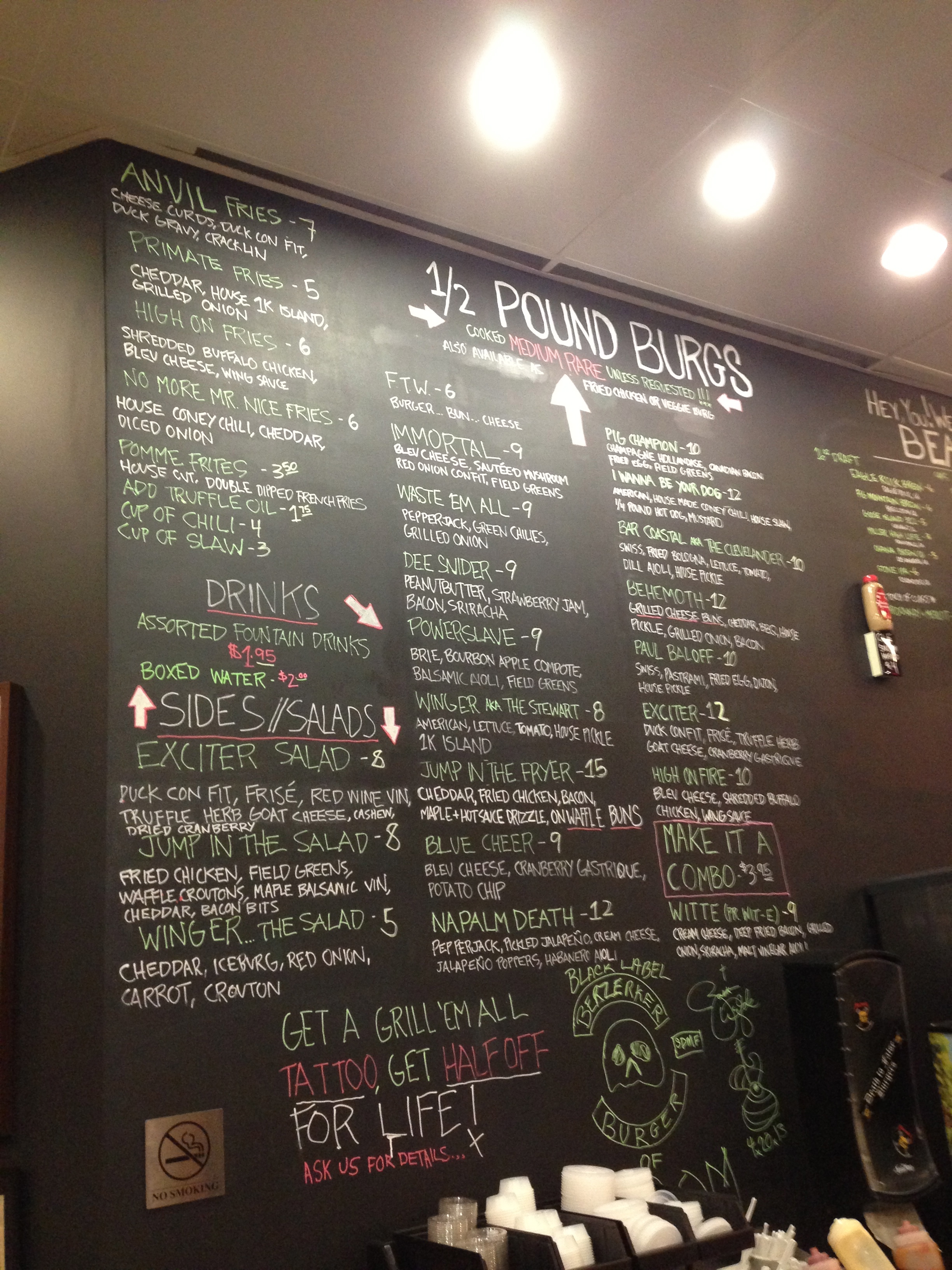 Upon entering I could not help but notice all the rockin’ artwork plastered over all the walls. The setting is definitely home to heavy metal enthusiasts and the menu was presented on an enormous black chalkboard. After carefully examined my options I decided to try the powerslave, a ½ lb burger with brie cheese, bourbon apple compote, balsamic aioli, and field greens. And because the sign said so I ordered it medium rare—good choice!