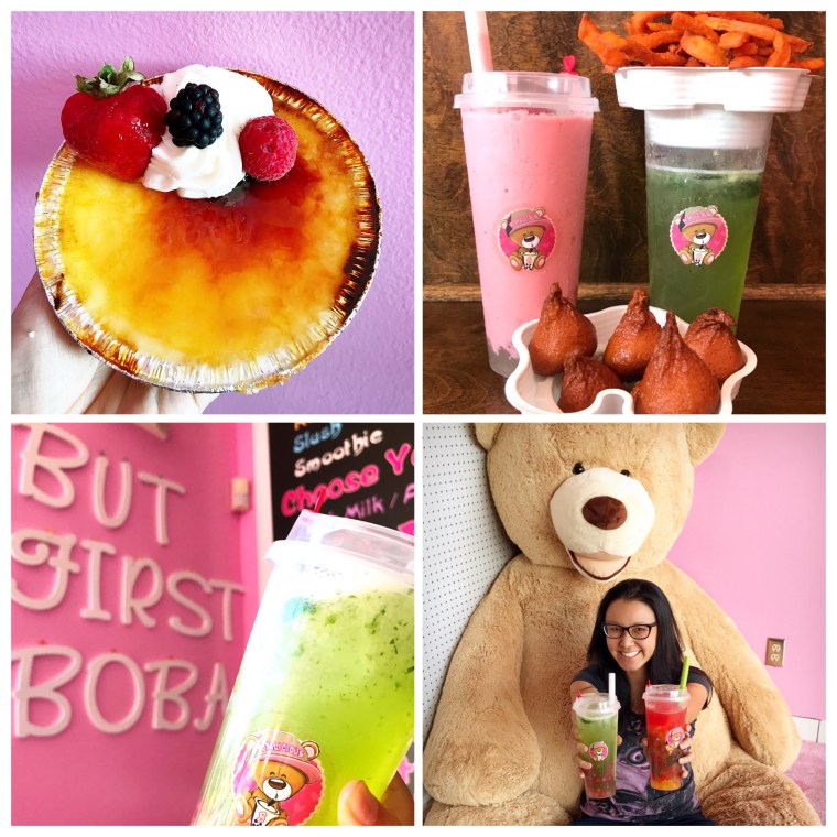 The shop is located in an unassuming strip mall, but once you enter you’ll be floored by the enormous teddy bear and bright pink decor.  I decided to order a strawberry yogurt drink with agar and found it to be a great sweet treat. I also took a sip of my friend’s cucumber drink with boba, and loved how light and refreshing it was. The size of the beverage is almost twice that of a typical boba tea shop and for $4 is a bargain. They also serve snacks in containers that fit on top of your drink, which makes it convenient should you need to grab and go. However, if you decide to sit and chat with some friends at their shop their taste in music is on point. There were playing 90s music on my visit and everything on their playlist reminded me of the good ole days.
