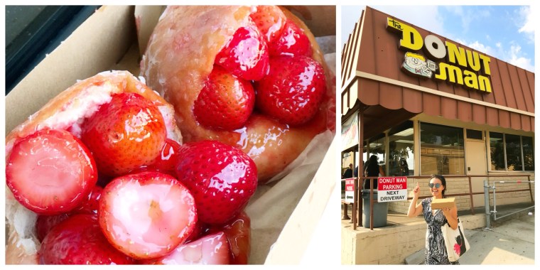 Earlier this month Cal Poly Pomona hosted their annual weekend Pumpkin Festival, which featured a corn maze, pony rides, produce vendors and of course their pumpkin patch! Coincidentally that was the same weekend (and LAST weekend) The Donut Man‘s Famous Strawberry Donut were going to be sold. I’ve never had the Alton Brown approved treats, so I knew I had to make it a priority. 🙂