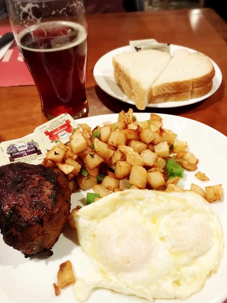Upon entering the building, the casino has an old school charm to it, the restaurant had multiple plaques indicating awards it’s won in the past including: Best Microbrewery and Best Cheap Eats. My friend and I decided to share the Steak and Eggs ($11.99 – I’m sure cheaper if we played with the Players Card), a pint of rootbeer ($2.50) and a pint of their seasonal beer ($2.50).