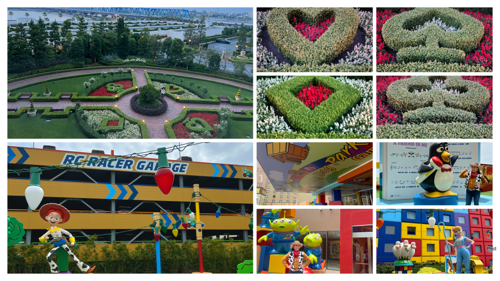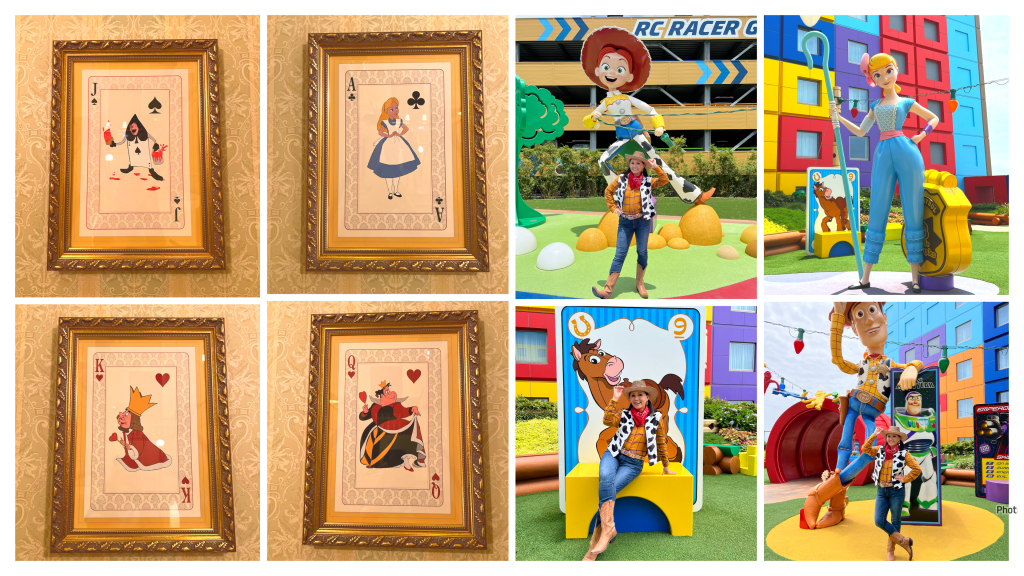 Toy Story: There are two courtyards and both are very playful. Between the RC Racer Garage and Hotel Entrance there’s a playground with giant Jessie, Buzz, and Slinky Dog’s Doghouse. Between two of the hotel towers is another courtyard with Woody and Bo Peep. Both courtyards have ample spaces for kids to run around, and there were a lot during my stay.